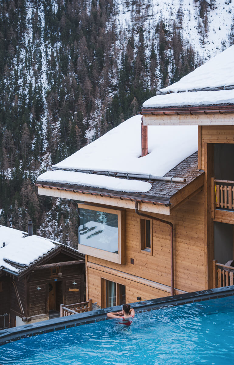 Gönnen Sie sich einen Moment purer Entspannung im Wellnessbereich der 5-Sterne- Ferienanlage Guernerés in Grimentz. Lassen Sie sich von der wohltuenden Wärme des 20 x 9 Meter großen, beheizten Innen- und Außenpools umhüllen, einer wahren Oase der Ruhe. Verlängern Sie das Erlebnis im Nassbereich zwischen Hammam, Sauna, Erlebnisduschen und Entspannungsbereich mit Liegestühlen. Im Außenbereich können Sie sich auf der Terrasse mit Blick auf die umliegenden Berggipfel erholen. Ein elegantes und intimes Ambiente, ideal, um nach einem Tag in den Bergen neue Energie zu tanken und im Herzen der Schweizer Alpen Ruhe, Ausgeglichenheit und Entspannung zu finden.