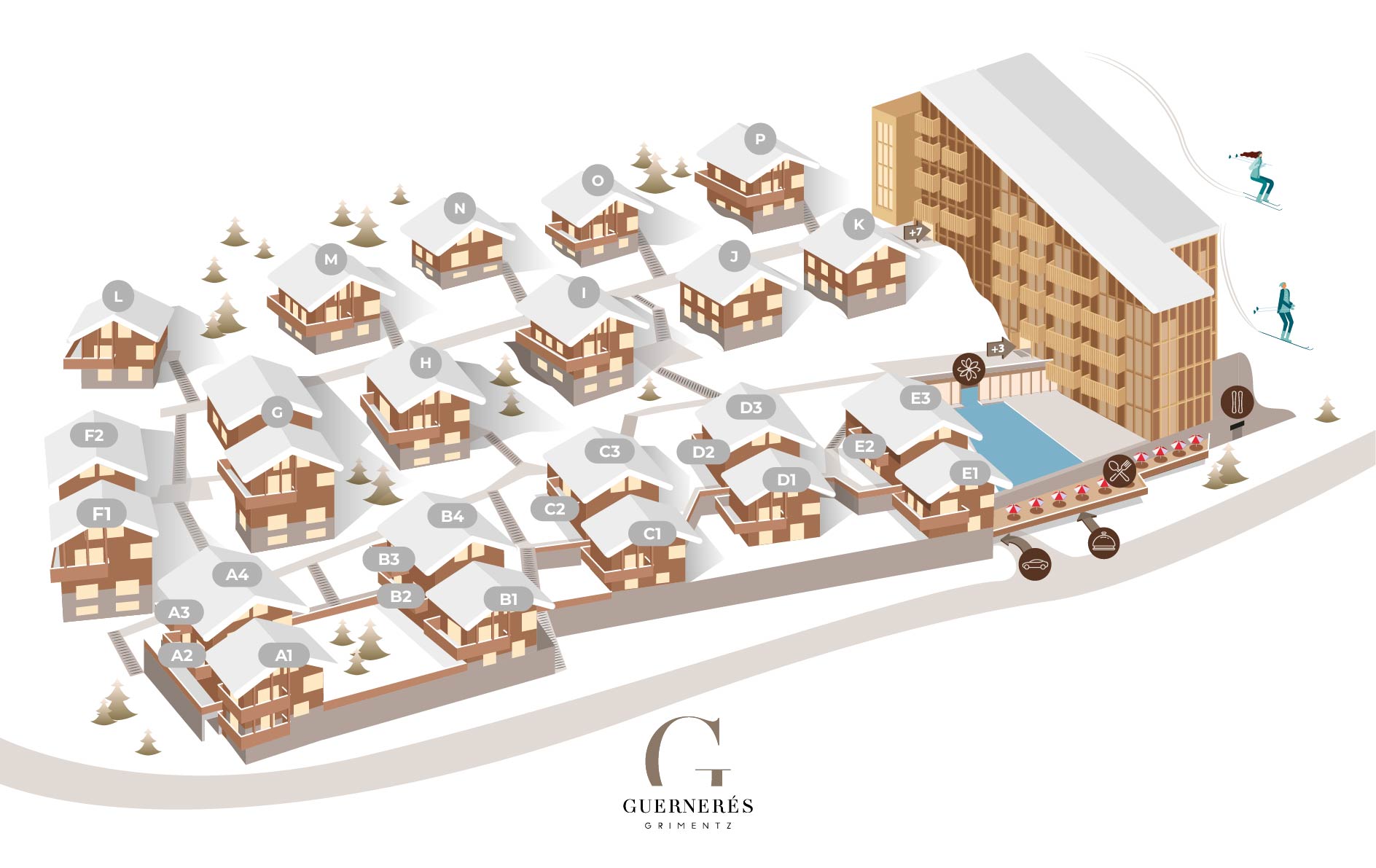 Die 5-Sterne- Ferienanlage Guernerés umfasst zwei sich ergänzende Bereiche: Die Chalets, echte intime Rückzugsorte, und die Residenz, das pulsierende Herzstück der Anlage, in dem sich alle gehobenen Hoteldienstleistungen konzentrieren. Wenn Sie sich für eines der Chalets entscheiden, profitieren Sie von einem privilegierten Zugang zu allen Gemeinschaftsbereichen in der Nähe: 700 m² großer Wellnessbereich mit Innen- und Außenpool, Spa, Fitnessraum mit Aussicht, Restaurant, Lounge-Bar, Kinderbereich und Rezeption mit maßgeschneidertem Concierge-Service. Eine perfekte Balance zwischen Unabhängigkeit und exklusiven Leistungen für einen außergewöhnlichen Sommerurlaub in den Bergen.